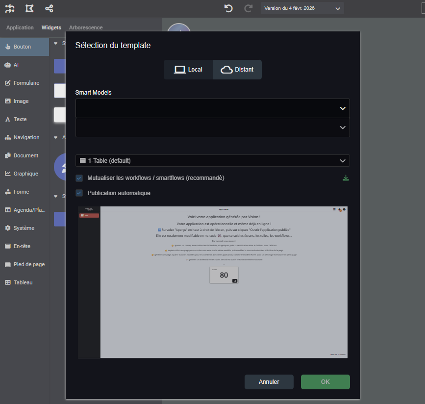 ➡️ Sélectionner l’application dans laquelle ajouter la nouvelle page (ex. « VISION MES », « VISION SupplyChain Client », etc.).